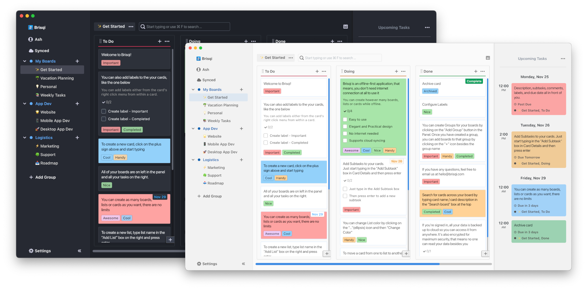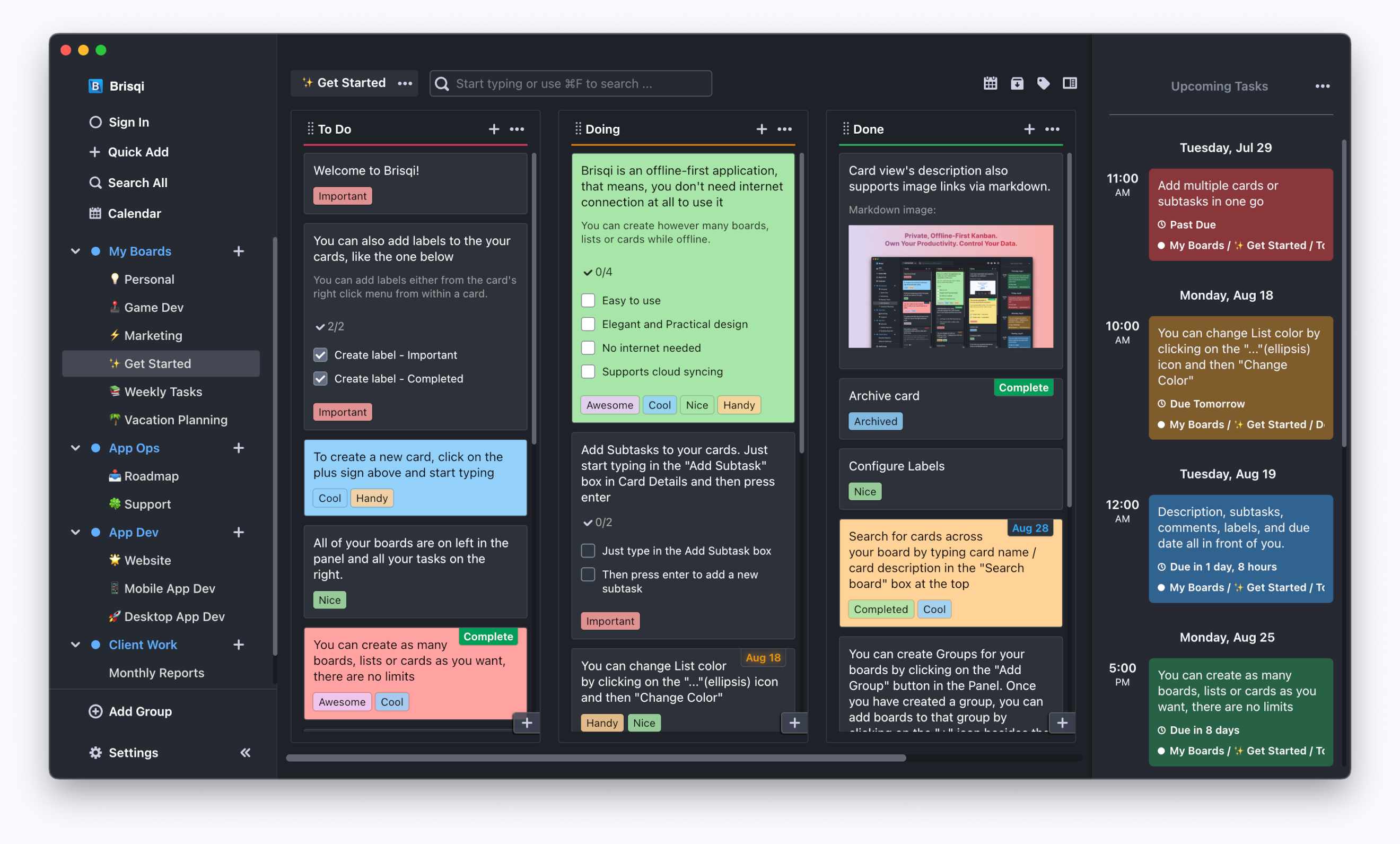 Brisqi has been a great addition to my workflow. I'm a big believer in Kanban for my current job, and wanted an offline, more personal solution. Brisqi accomplished that for me with a clean UI, good customization options, mobile app, and more. Plus, Ash is constantly updating the app and it's clear he cares about it. I highly recommend.